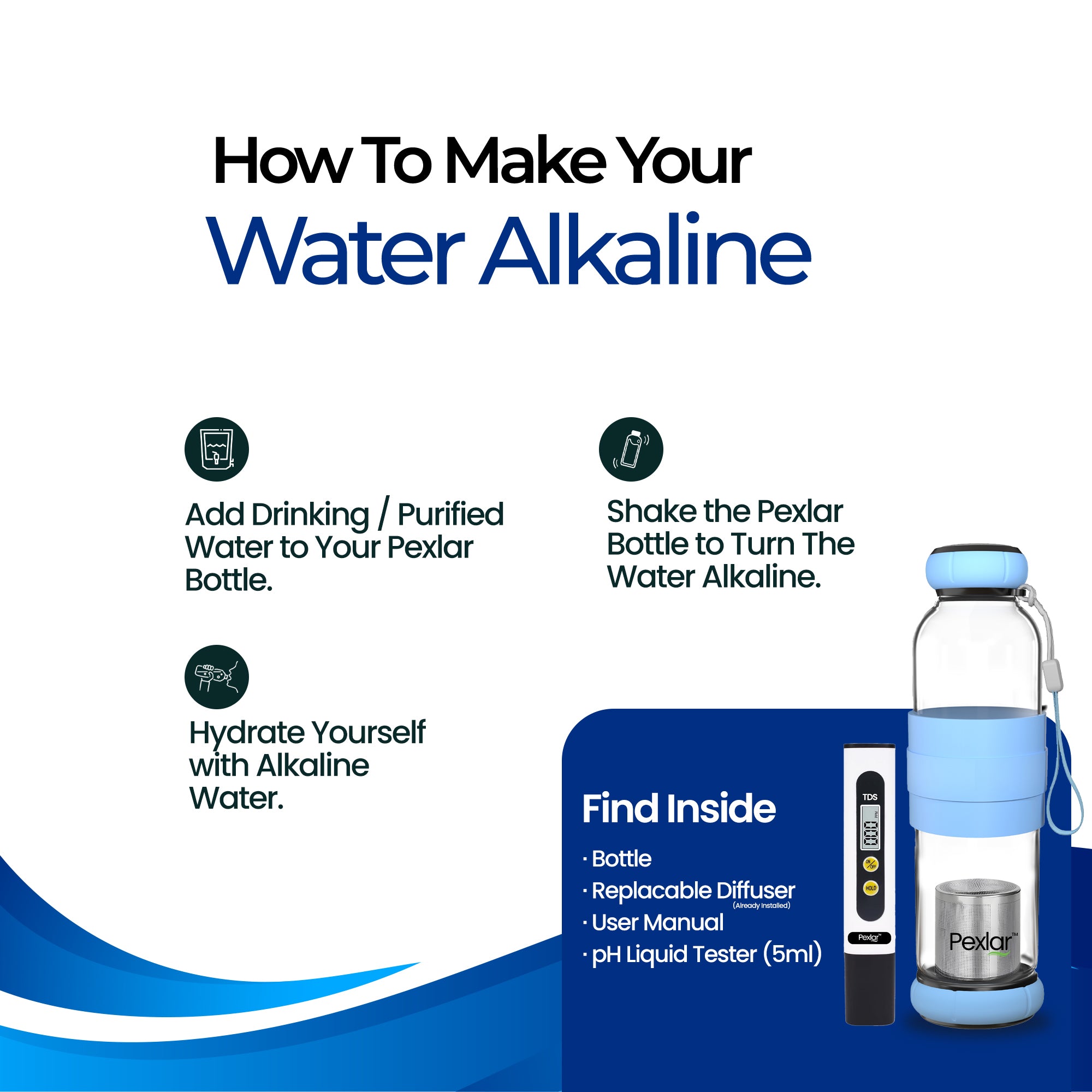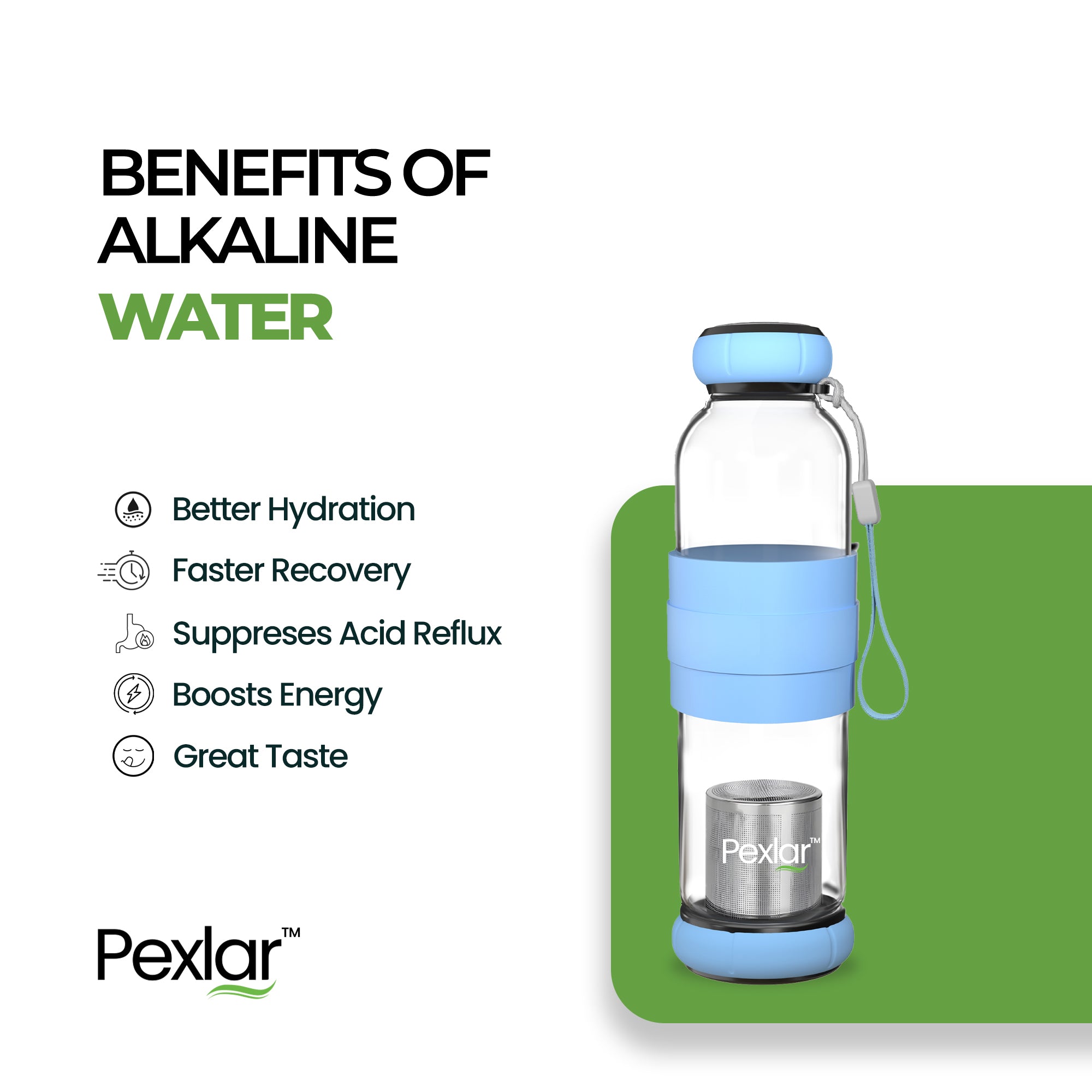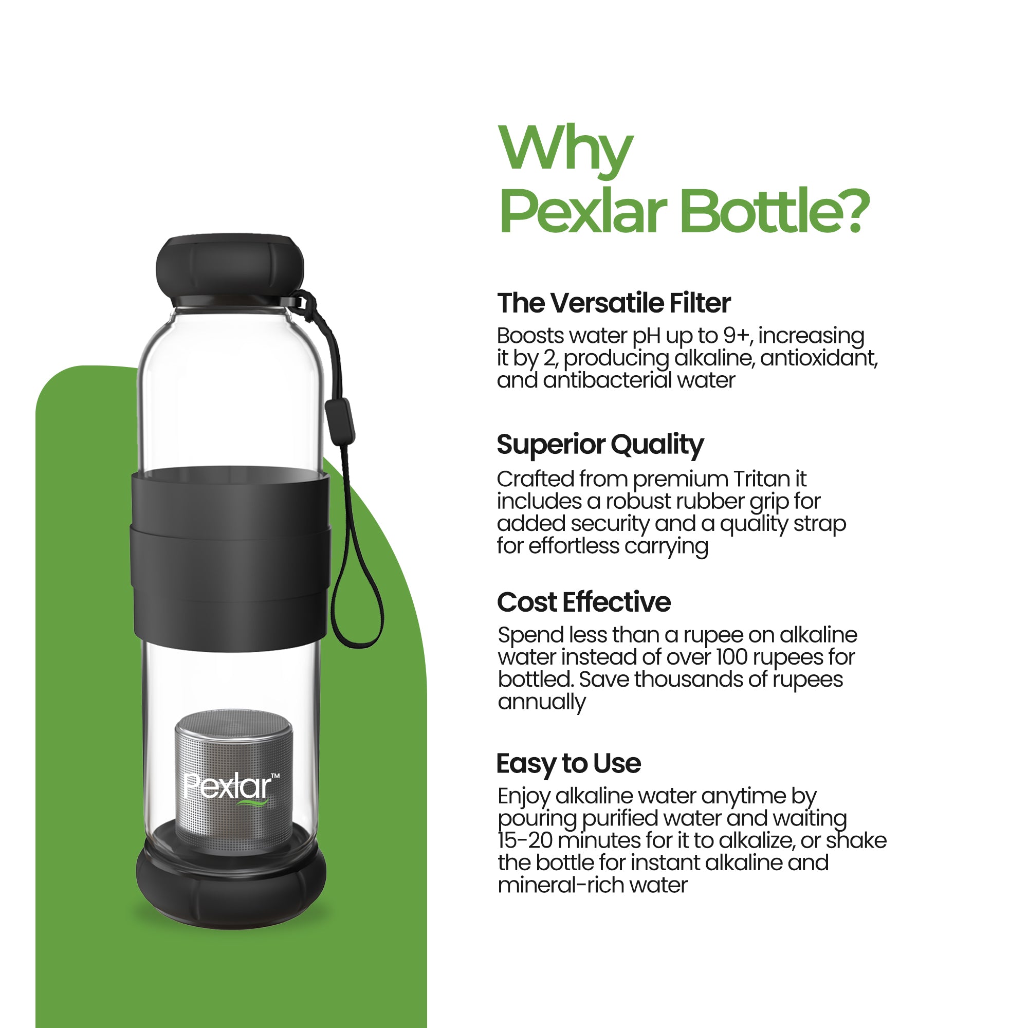 The Pexlar Alkaline Water Bottle transforms regular water into antioxidant, antibacterial, and mineral-enriched alkaline water with a pH of up to 8.5–9+. Designed with premium Tritan material for durability, it features an innovative multi-stage filtration system that removes impurities while infusing essential minerals like calcium, magnesium, and potassium.