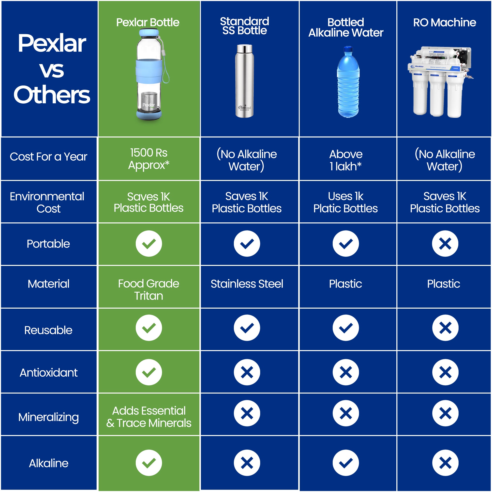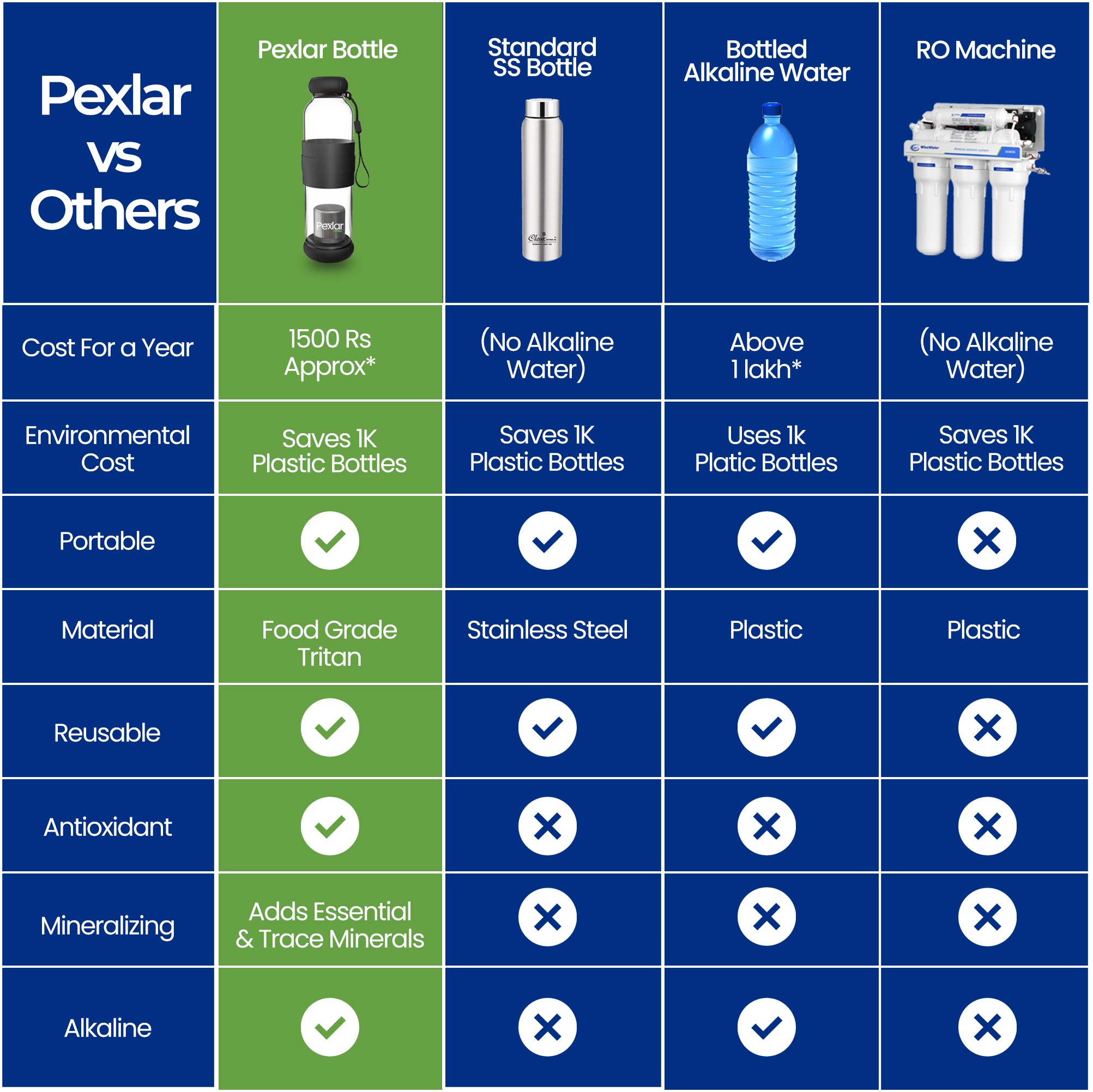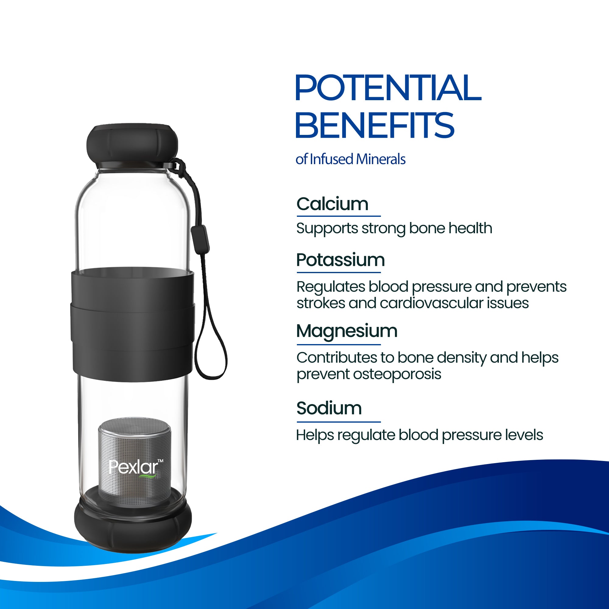The Pexlar Alkaline Water Bottle transforms regular water into antioxidant, antibacterial, and mineral-enriched alkaline water with a pH of up to 8.5–9+. Designed with premium Tritan material for durability, it features an innovative multi-stage filtration system that removes impurities while infusing essential minerals like calcium, magnesium, and potassium.